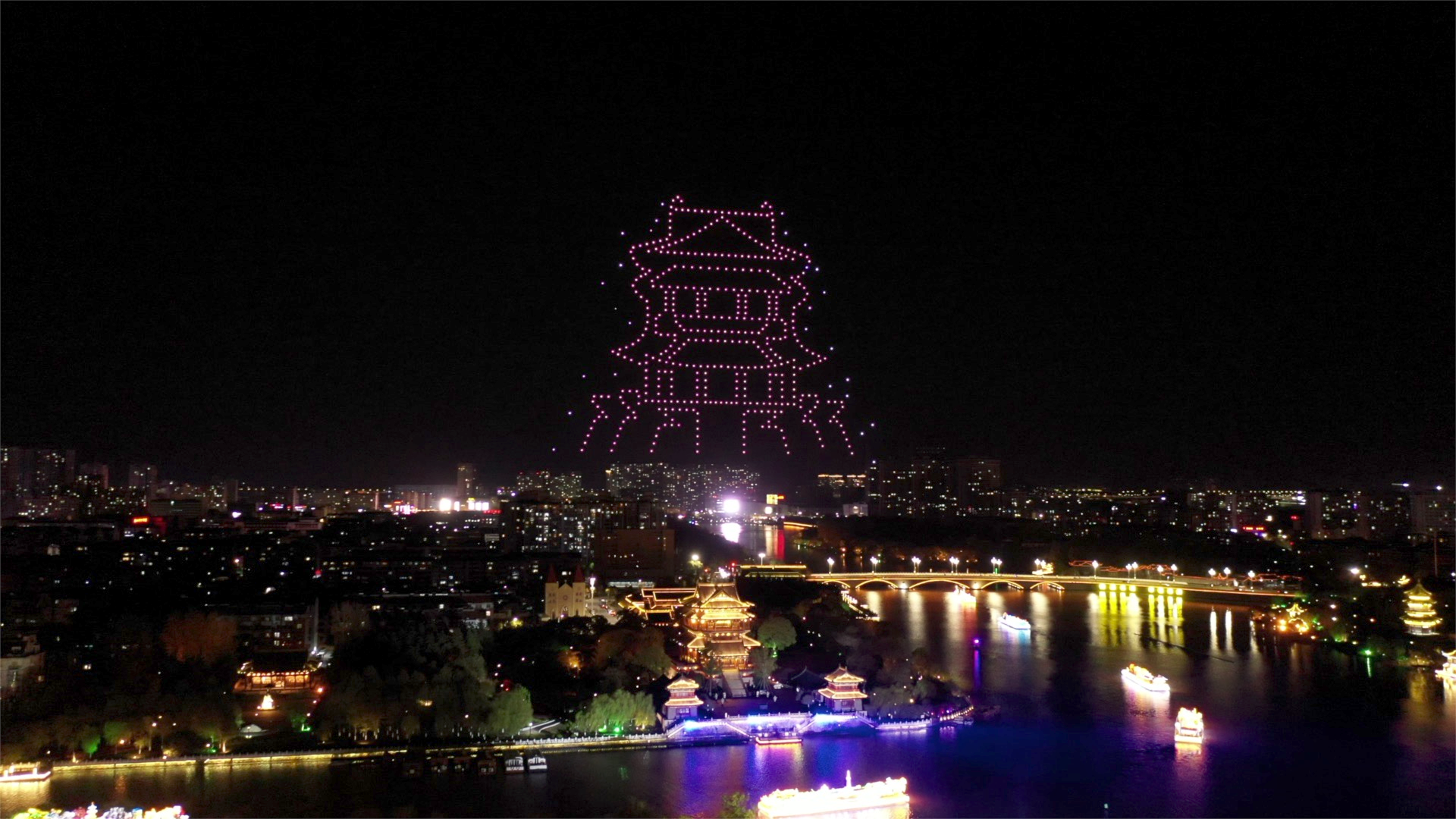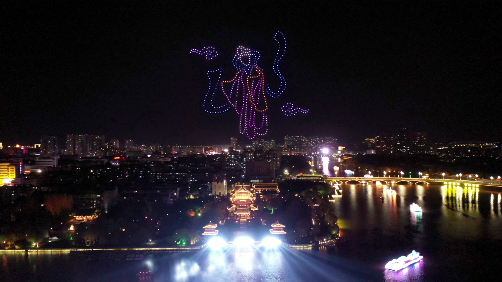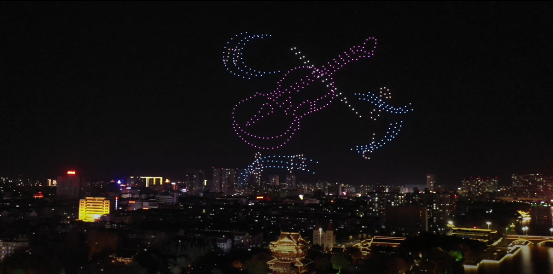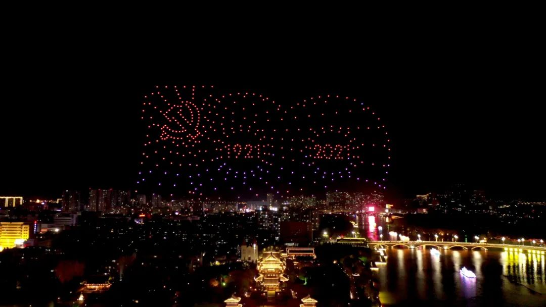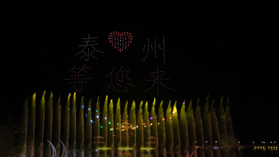 在第十二届泰州水城水乡国际旅游节启动仪式上,江苏省演艺集团有限公司携手大风寰宇无人机技术(北京)有限公司以望海楼为背景,500架无人机编队表演腾空而起,在夜空中变化出“幸福水天堂”“梅兰芳”“建党百年”等字样和凤凰、郑板桥等造型,场面壮阔,令人震撼!