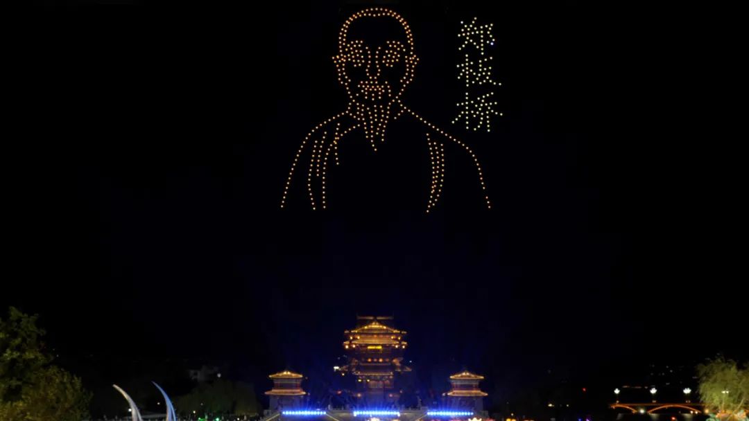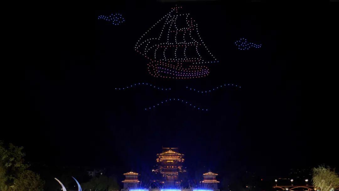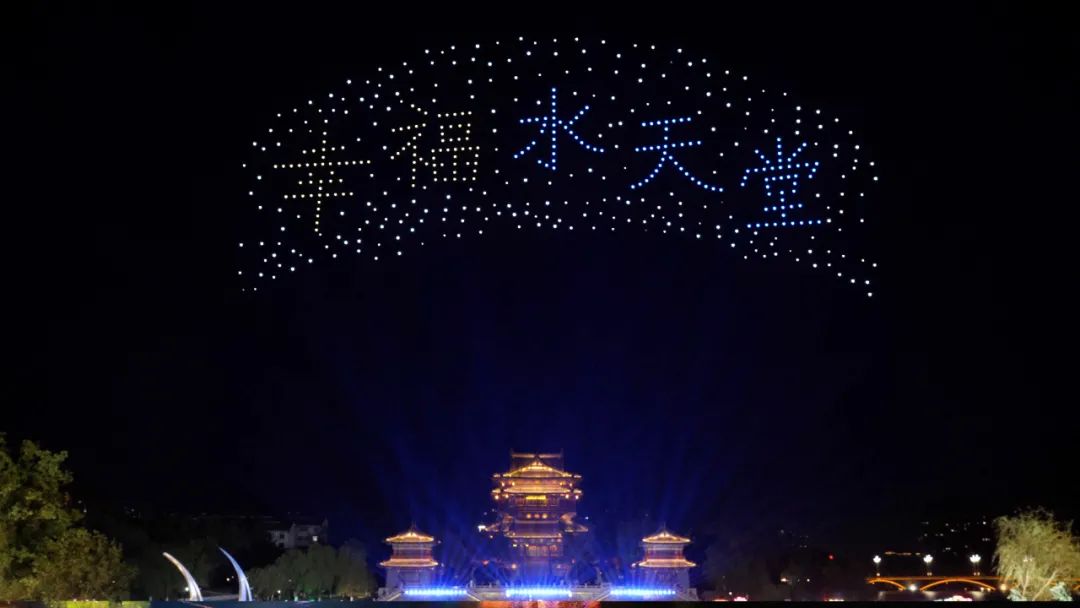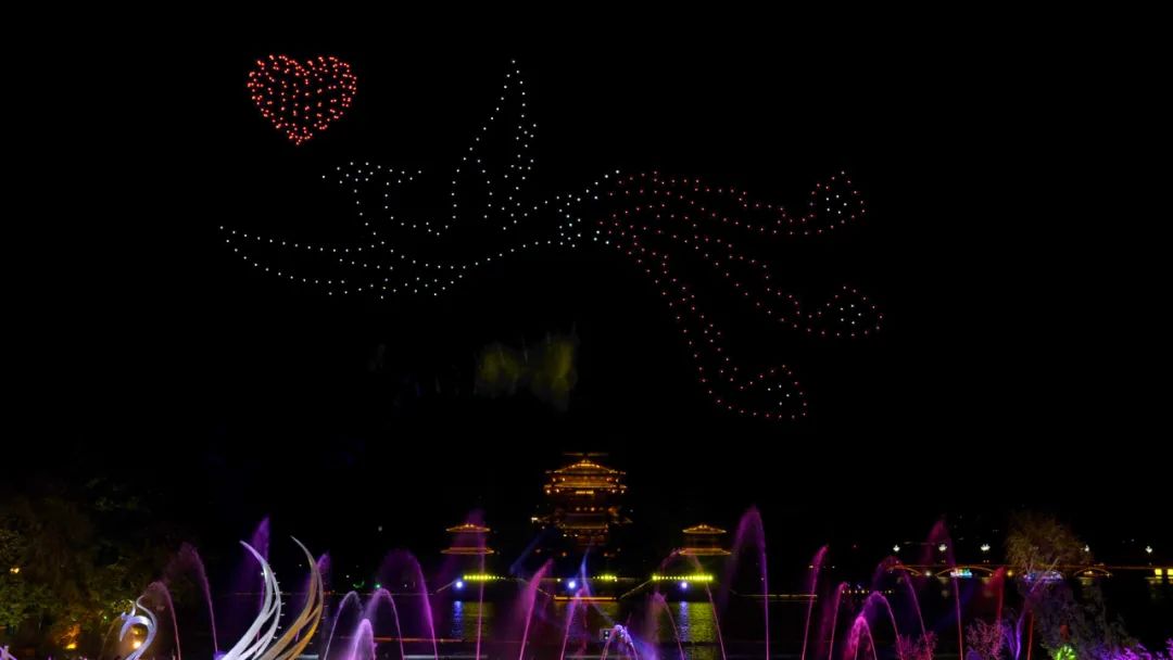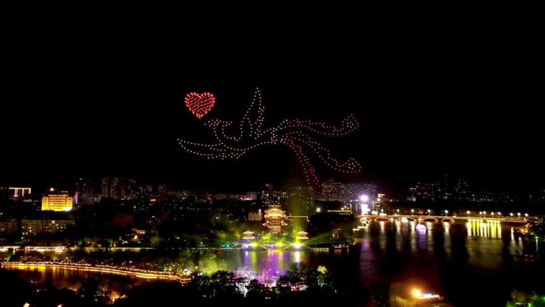 在第十二届泰州水城水乡国际旅游节启动仪式上,江苏省演艺集团有限公司携手大风寰宇无人机技术(北京)有限公司以望海楼为背景,500架无人机编队表演腾空而起,在夜空中变化出“幸福水天堂”“梅兰芳”“建党百年”等字样和凤凰、郑板桥等造型,场面壮阔,令人震撼!
